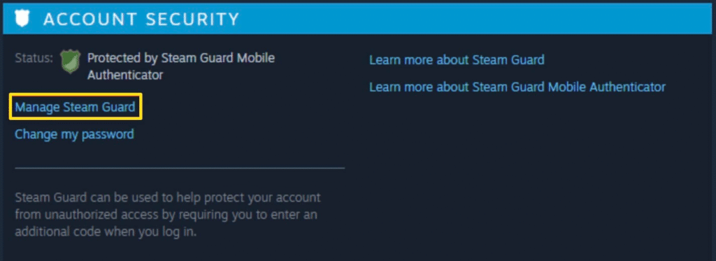 “Account Security” সেকশনে গিয়ে Manage Steam Guard বাটনে ক্লিক করুন।